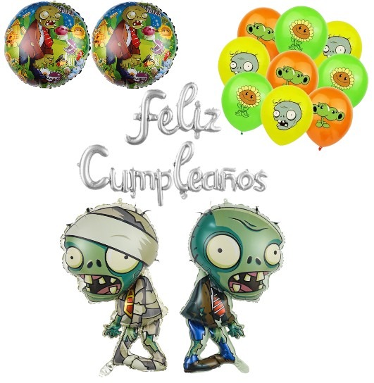 Set Globos Aluminio + 12 globos Látex Feliz Cumpleaños Plantas vs Zombies